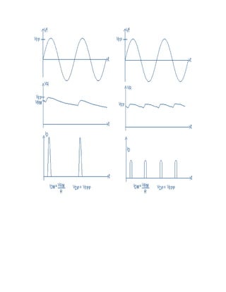 Este documento describe los conceptos básicos de rectificadores de media onda y onda completa, incluido su funcionamiento teórico y experimental. Explica qué es un diodo, para qué sirve y su historia. Luego detalla los componentes, equipos y pasos para construir y probar rectificadores de media onda y puente de onda completa experimentalmente, midiendo las señales de entrada y salida. Concluye que se observaron las variaciones de la señal debido a los cambios en los componentes y recomienda no usar un puente rect