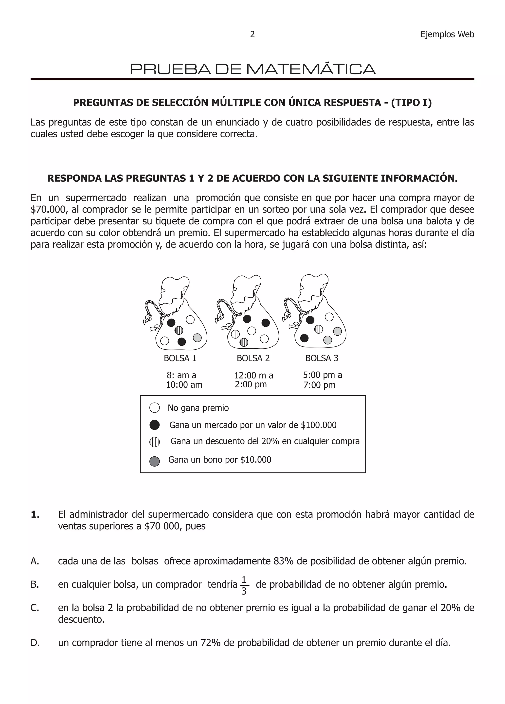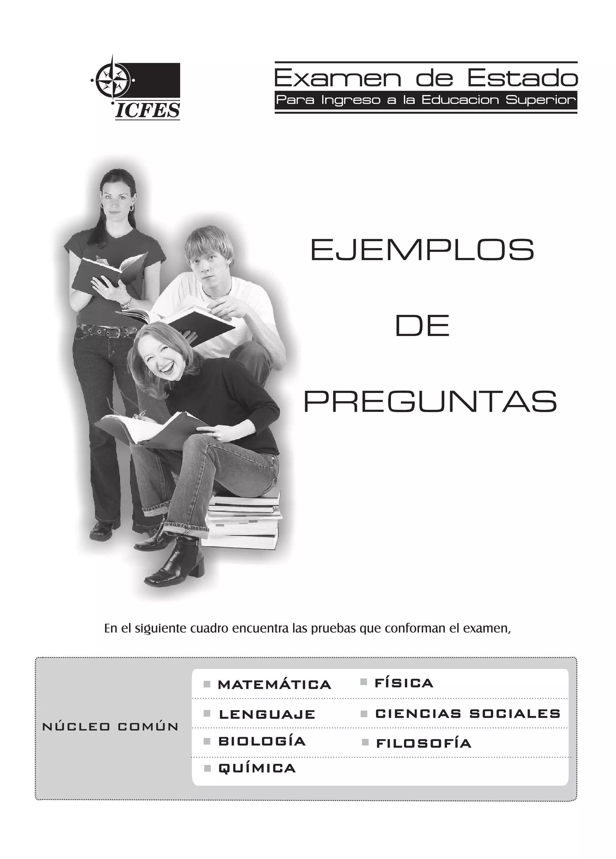 El documento presenta ejemplos de preguntas de selección múltiple para pruebas de matemáticas, lenguaje y biología. Incluye información como gráficas y tablas para responder las preguntas. Las preguntas abarcan temas como probabilidad, experimentos con ratones, novelas policiales y ciclos biológicos.