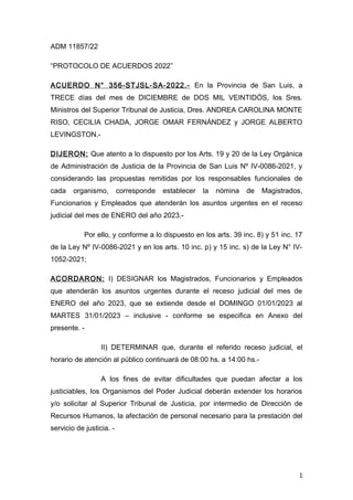 El documento establece la nómina de magistrados, funcionarios y empleados que atenderán asuntos urgentes durante el receso judicial de enero de 2023 en la provincia de San Luis. Designa responsables para diferentes organismos del Poder Judicial como el Superior Tribunal de Justicia, la Secretaría Administrativa, la Secretaría de Informática Judicial y el Consejo de la Magistratura entre otros. También determina horarios de atención y licencias compensatorias para el personal durante dicho período.