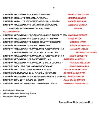 La Comisión Deportiva Automovilística del Automóvil Club Argentino realizará una ceremonia el 29 de marzo para entregar premios a los campeones de las diferentes categorías del automovilismo nacional de 2010, incluyendo TC 2000, Turismo Carretera, Fórmula Renault, Rally y karting. Más de 20 pilotos y navegantes serán reconocidos por sus logros deportivos durante el año pasado.