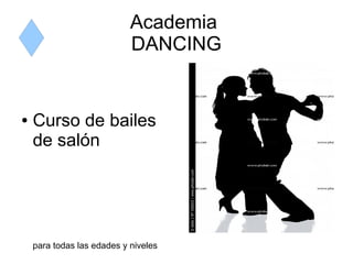 Este documento presenta una academia de baile llamada DANCING que ofrece cursos de baile de salón para todas las edades y niveles. Describe que no es necesario saber bailar para unirse a uno de sus diversos cursos diseñados para diferentes niveles de aprendizaje. Anima a las personas que se sienten torpes a probar uno de sus cursos para dejar atrás la excusa de "no saber bailar" y sentir la música en el cuerpo. Proporciona los detalles de contacto para obtener más información.