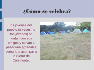 La acampada es una tradición anual de Semana Santa en Calamonte donde los jóvenes del pueblo se reúnen con amigos y pasan una semana acampando en la Sierra de Calamonte. Preparan las tiendas el primer día y luego comparten comidas, hogueras y fiestas mientras conviven durante la semana. Por las noches, cada grupo socializa bebiendo y visitando otras acampadas cercanas.