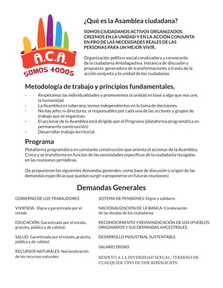 La Asamblea Ciudadana es una organización política y social en Antofagasta, Chile, que busca promover la unidad y acción conjunta de los ciudadanos para mejorar sus vidas. Representa a los ciudadanos y genera propuestas para crear cambios a través del diálogo y trabajo en equipo. Su programa se construye colectivamente y aboga por demandas como educación y salud públicas y de calidad, vivienda digna, y nacionalización de recursos naturales y la banca.