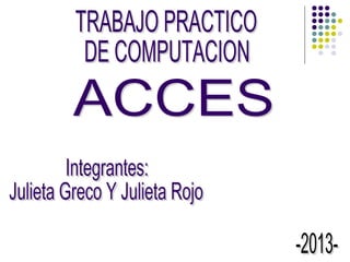 Access es un sistema de gestión de bases de datos de Microsoft Office que permite organizar y presentar información en tablas. Una base de datos relacional almacena datos en tablas interconectadas mediante relaciones uno a uno, uno a varios o varios a varios. Las consultas permiten recuperar y modificar datos de las tablas. Los formularios y informes sirven para presentar los datos de forma profesional.