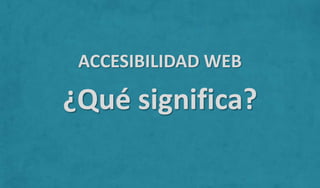 El documento habla sobre la importancia de la accesibilidad web para que los sitios sean utilizables por la mayor cantidad de personas posible, independientemente de sus capacidades, y explica que la accesibilidad no se refiere solo a las discapacidades sino a diferentes entornos, habilidades y culturas. También menciona algunas barreras comunes y estrategias para mejorar la accesibilidad como usar un lenguaje simple, agregar subtítulos y descripciones de imágenes.