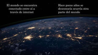 El documento describe cómo el mundo está cada vez más interconectado debido a Internet. Internet permite que las personas se comuniquen y conozcan otras culturas desde cualquier lugar. Además, todo, desde las empresas hasta los gobiernos, ahora dependen de Internet, por lo que se puede decir que el mundo está globalizado y conectado a través de esta red.
