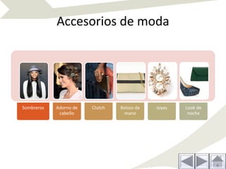 Este documento describe diferentes accesorios de moda como sombreros, adornos para el cabello, bolsos, joyas y cómo pueden usarse para complementar diferentes looks o estilos tanto para eventos casuales como formales. Se mencionan opciones como diademas, cintas trenzadas y estilos clásicos para el cabello, y bolsos y joyas pequeñas que son prácticos y fáciles de combinar con diferentes atuendos y ocasiones.
