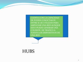 Este documento describe diferentes tipos de dispositivos de red como hubs, switches, routers y bridges. Detalla los modelos, precios y funciones de estos dispositivos, incluidos los hubs Mini y Extra con 4 puertos y precios de $4.90 y $89 respectivamente. También describe la arquitectura y tecnologías de switches ATM de IBM como el modelo 2230 con 16 puertos y capacidad de 5 Gbps.
