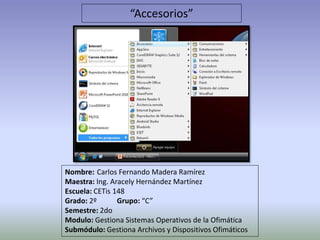Este documento describe algunos de los accesorios incluidos en Windows, como el control de volumen, el reproductor de Windows Media, el bloc de notas, la calculadora, Paint y WordPad. Explica cómo acceder a la carpeta de Accesorios a través del menú Inicio y cómo usar algunas de las herramientas como el control de volumen, la calculadora científica y las funciones básicas de Paint y WordPad.