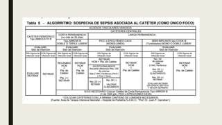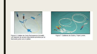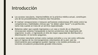 El documento resume los principales tipos de accesos vasculares, incluyendo su clasificación, factores de riesgo asociados a su uso, posibles complicaciones como infecciones, y criterios para el diagnóstico y definición de infecciones relacionadas a catéteres intravasculares.