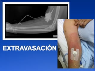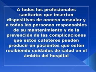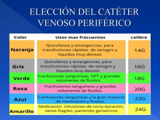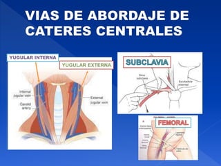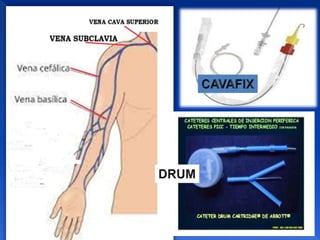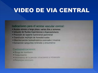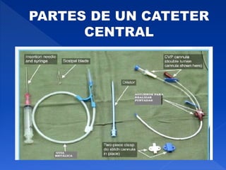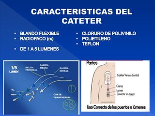 Este documento describe diferentes tipos de cateteres venosos centrales, sus indicaciones y complicaciones. Describe cateteres no tunelizados, tunelizados e implantables totalmente y explica cómo prevenir infecciones asociadas a los cateteres centrales mediante una buena higiene. También resume los pasos para realizar la curación de un catéter venoso central.