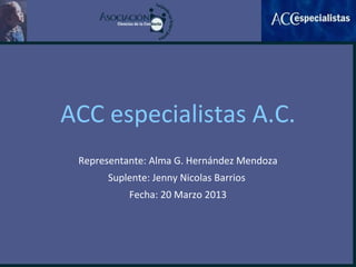 ACC especialistas A.C. es una organización sin fines de lucro que brinda servicios de rehabilitación educativa y psicológica a grupos vulnerables. Su misión es canalizar recursos al desarrollo de estos servicios. Su visión es ser líder en la prestación de servicios clínicos, ofrecer servicios residenciales y laborales dignos, y atender familias de todo el país a través de programas sociales y tecnológicos.