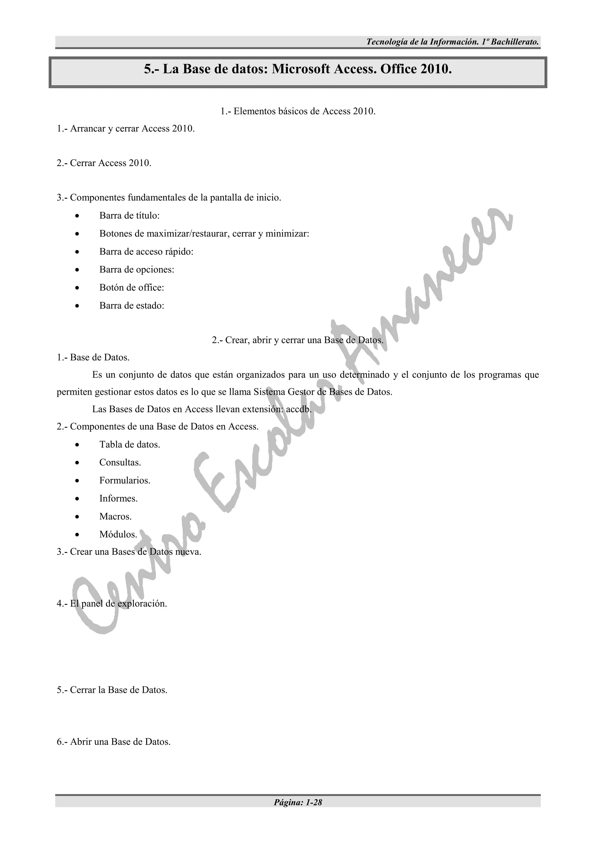 Este documento proporciona instrucciones detalladas sobre cómo usar Microsoft Access 2010, incluyendo cómo crear y modificar bases de datos, tablas, consultas, formularios e informes. Explica conceptos clave como relaciones entre tablas, propiedades de campos, filtros, macros y más. El objetivo es enseñar a los estudiantes de bachillerato los fundamentos de las bases de datos y cómo gestionar información en Access.