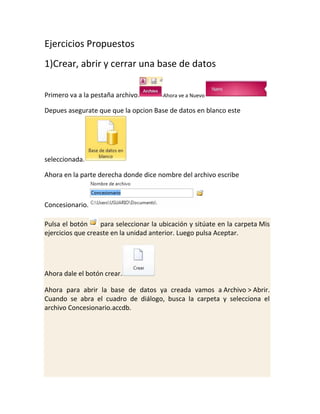 Este documento presenta una serie de 10 ejercicios propuestos sobre el uso de Microsoft Access para crear y modificar bases de datos. Los ejercicios cubren temas como crear y modificar tablas, relaciones, consultas, formularios y herramientas. El objetivo general es familiarizarse con las principales funciones de Access para gestionar bases de datos.