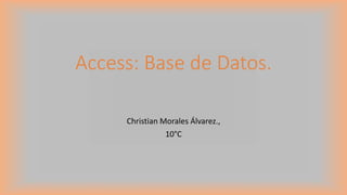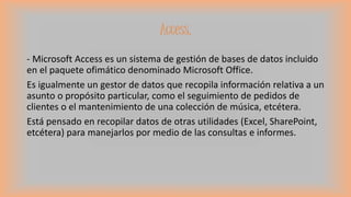 Access es un sistema de gestión de bases de datos incluido en Microsoft Office que permite recopilar y organizar información en tablas, formularios e informes. Comparte características con Excel como vínculos de datos y herramientas básicas, pero se enfoca más en el manejo y almacenamiento de datos a través de consultas, macros y módulos. Conceptos clave de Access incluyen bases de datos, tablas, formularios, informes y consultas.