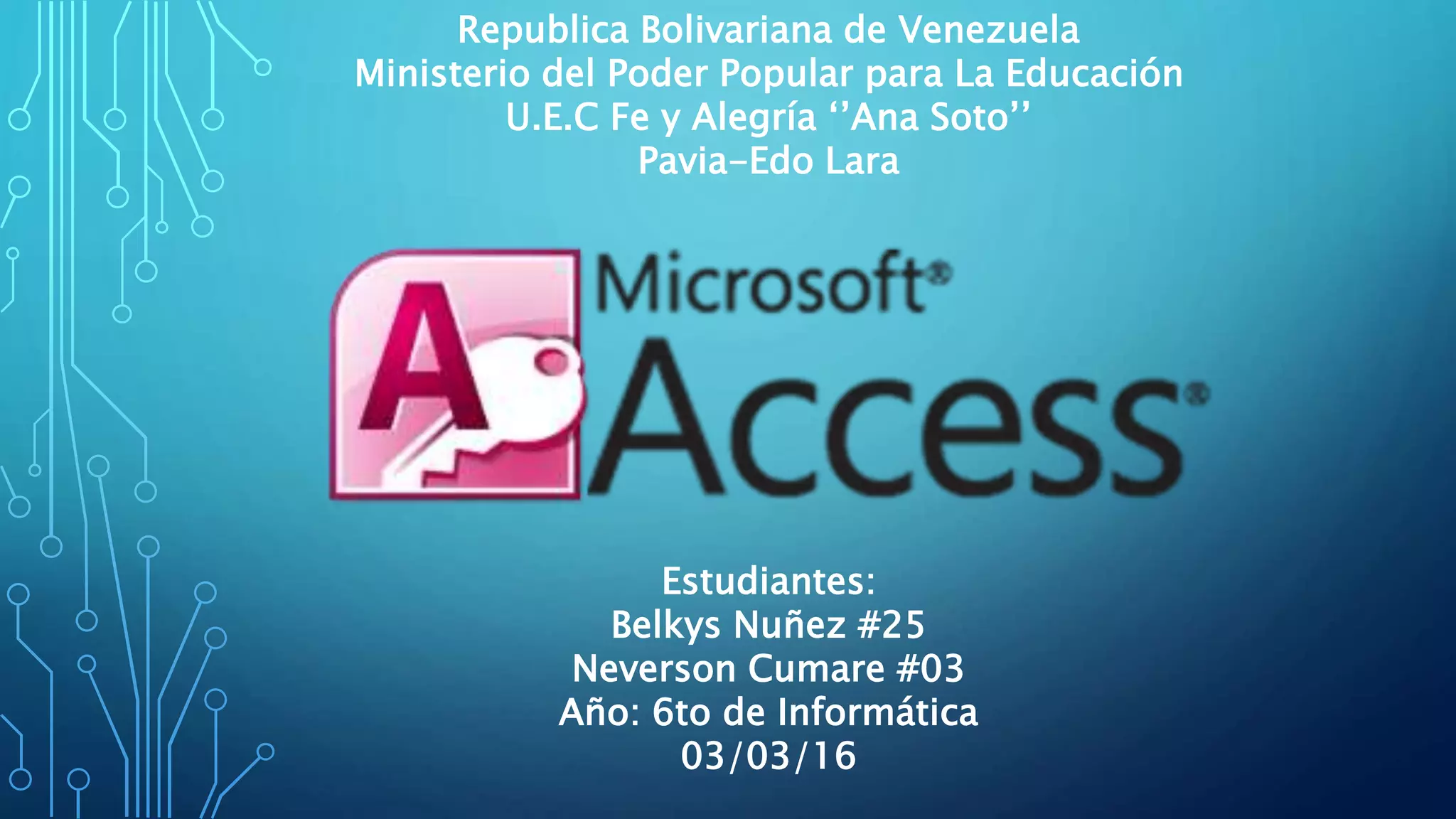 Microsoft Access comenzó como una aplicación de base de datos de escritorio en 1990 y ha pasado por varias versiones hasta la actualidad. Ha evolucionado para admitir nuevos formatos de archivo, tipos de datos más complejos, y mayor integración con Microsoft Office y Windows. Aunque es adecuado para proyectos escolares y pequeñas empresas, tiene limitaciones para uso empresarial a gran escala debido a problemas de rendimiento y seguridad.