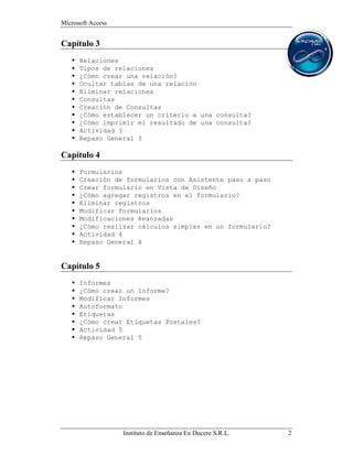 Este documento presenta un temario para un curso de Microsoft Access dividido en 7 capítulos. Los capítulos cubren temas como crear y modificar tablas y bases de datos, realizar búsquedas y filtros de datos, establecer relaciones entre tablas, crear formularios, informes, macros y paneles de control, e importar y vincular datos externos. Cada capítulo incluye objetivos de aprendizaje, actividades prácticas y repasos.