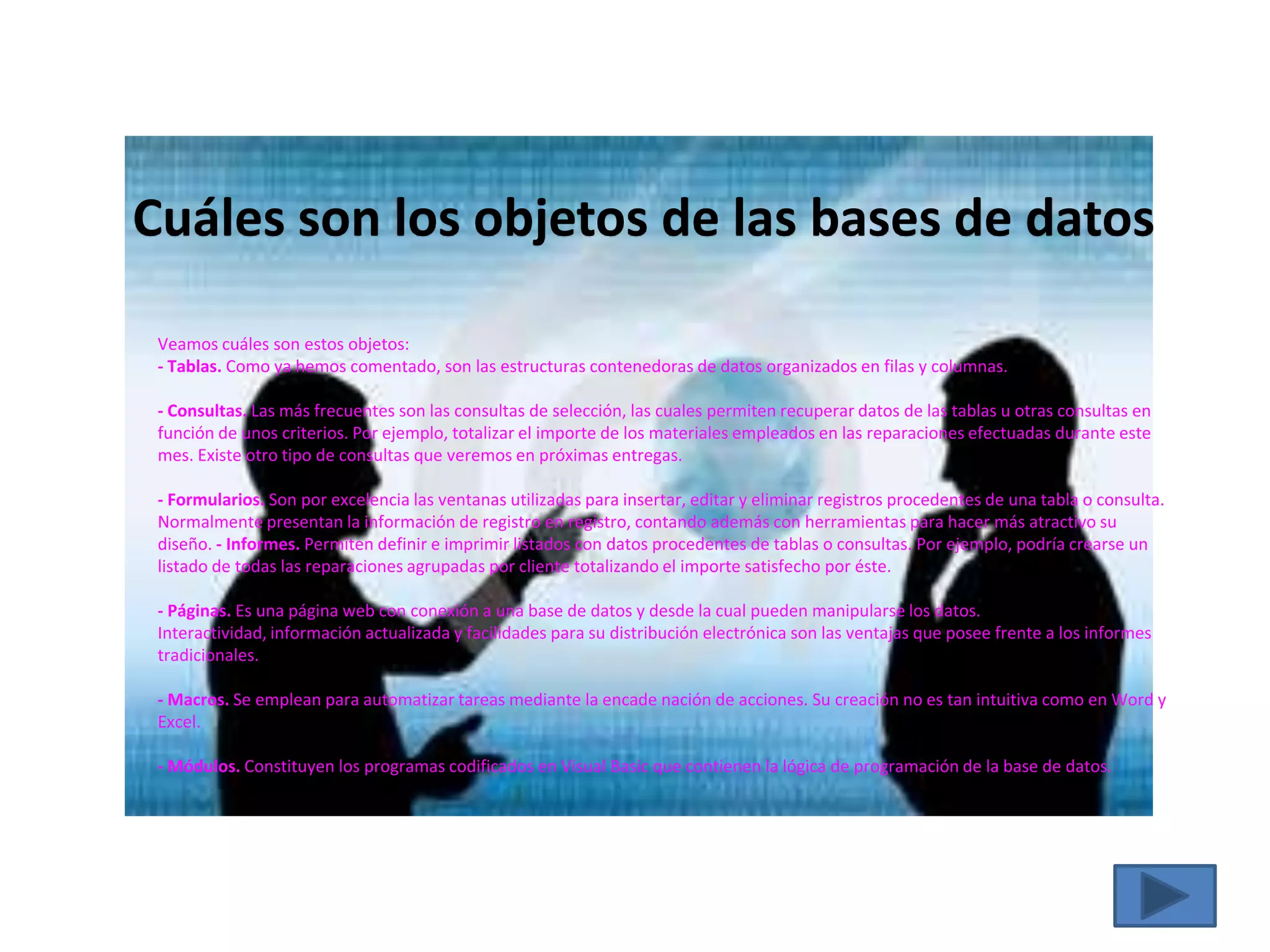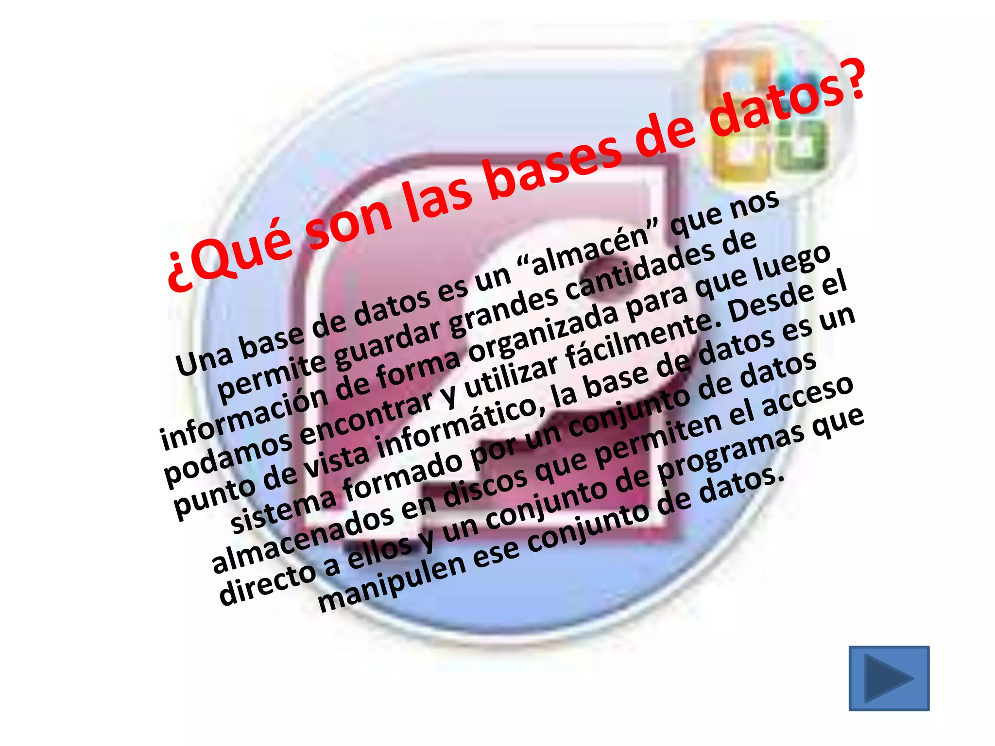Una base de datos es un sistema que permite almacenar y organizar grandes cantidades de información para poder acceder y usarla fácilmente. Está formada por un conjunto de datos almacenados en discos y programas que permiten manipular esos datos. Las bases de datos contienen tablas, consultas, formularios, informes, páginas, macros y módulos que permiten organizar y acceder a la información de manera flexible. Microsoft Access y MySQL son ejemplos de sistemas de gestión de bases de datos relacionales.