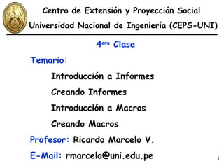 El documento presenta una introducción a la creación de informes en Microsoft Access. Explica los diferentes formatos de informes, incluidos los formatos tabulares, por grupos y gráficos. Luego describe el proceso de creación de informes utilizando el asistente para informes o la vista de diseño, incluida la selección de campos, ordenación, agrupación y estilo. Finalmente, proporciona ejemplos detallados de cómo crear informes tabulares, por grupos y con detalles de pedidos agrupados.