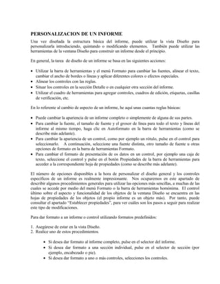 Este documento describe cómo personalizar y dar formato a los informes en Microsoft Access. Explica cómo utilizar las herramientas de diseño para agregar campos y controles, cambiar fuentes y formatos, y ordenar y agrupar registros. También cubre cómo establecer propiedades y crear informes a partir de registros filtrados.