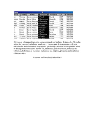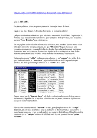 Microsoft Access es un programa para crear y manejar bases de datos. Una base de datos almacena información en tablas ordenadas, donde cada columna representa un campo de datos y cada fila representa un registro. Access permite filtrar y ordenar los datos de las tablas usando índices en campos clave. De esta forma, Access puede organizar y buscar eficientemente grandes volúmenes de información, como guías telefónicas, registros médicos, facturas u otros conjuntos de datos.