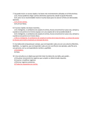 El documento contiene preguntas sobre conceptos básicos de bases de datos en Microsoft Access como la creación y extensión de archivos de bases de datos, el panel de navegación, formas de abrir bases de datos, los elementos más importantes de una base de datos (tablas), y el propósito de las consultas (visualizar, insertar, modificar y eliminar registros).
