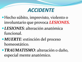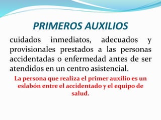 El documento habla sobre primeros auxilios y accidentes. Explica que los primeros auxilios son cuidados provisionales prestados a personas accidentadas antes de ser atendidas médicamente. Su objetivo es conservar vidas, evitar complicaciones y ayudar en la recuperación. También describe cómo evaluar a un accidentado y la importancia de llamar a emergencias en ciertas situaciones graves.