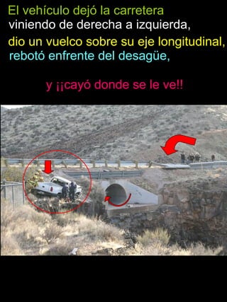 El vehículo se salió de la carretera y dio un vuelco, rebotando frente a un desagüe antes de caer volcado en la posición que se muestra en la foto. La segunda foto muestra el vehículo volcado en más detalle.