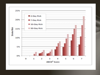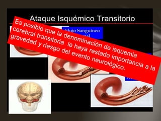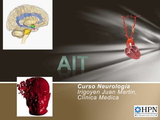 El documento trata sobre ataques isquémicos transitorios (AIT), definidos como episodios breves de disfunción neurológica causados por isquemia cerebral transitoria que duran menos de una hora. Se discuten las nuevas definiciones operacionales de AIT, los factores de riesgo de sufrir un accidente cerebrovascular posterior, y las estrategias de evaluación, tratamiento y prevención secundaria luego de un episodio de AIT.