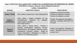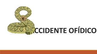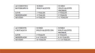 Este documento describe los diferentes tipos de accidentes ofídicos causados por serpientes venenosas en Colombia, incluyendo los accidentes bothrópicos (causados principalmente por la serpiente mapaná), crotálicos, elapídicos o micrúricos y lachésicos. Explica las manifestaciones locales y sistémicas de cada tipo de accidente, así como las acciones recomendadas para el tratamiento inicial y hospitalario de los pacientes, incluyendo la aplicación de sueros antiofídicos polivalentes o monovalentes según el tipo de