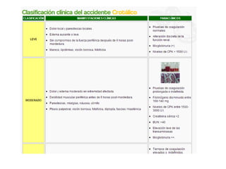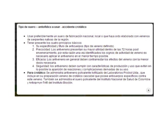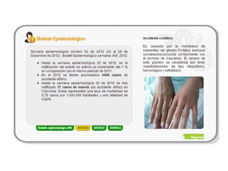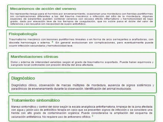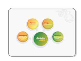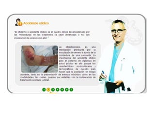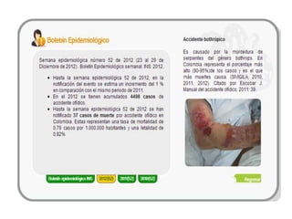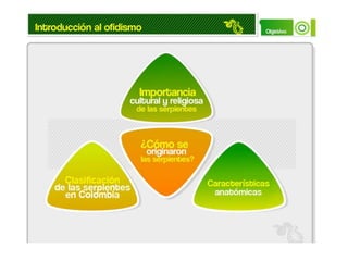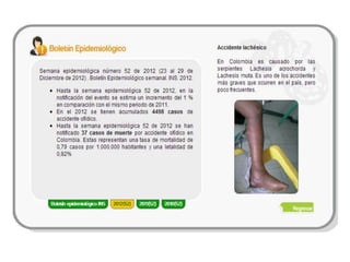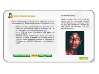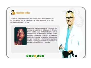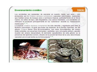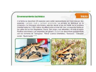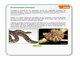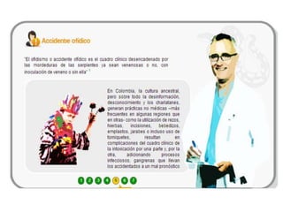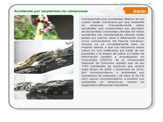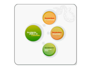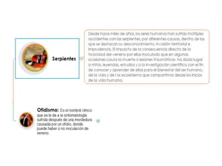El documento aborda el fenómeno del accidente ofídico, analizando la simbología y mitología de la serpiente en diversas culturas, su relación con la medicina y la salud a lo largo de la historia, así como el impacto de las mordeduras de serpiente en Colombia. Se enfatiza la importancia del tratamiento oportuno para prevenir complicaciones y mortalidad, destacando la necesidad de educación y prevención en la población en riesgo. Además, se menciona que los accidentes ofídicos deben ser notificados bajo el sistema de vigilancia en salud pública en el país.