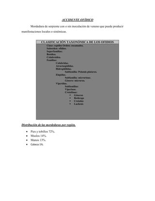 Este documento describe un accidente ofídico causado por una serpiente del género Bothrops. Describe las características de este género de serpientes, los efectos del veneno en el cuerpo, las manifestaciones clínicas como edema, hemorragia y coagulopatía, y una clasificación de la gravedad del accidente bothrópico de ausente a severo dependiendo de los síntomas.