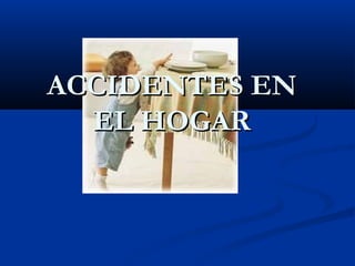 Este documento discute los accidentes en el hogar que afectan a niños menores de 5 años. Presenta datos sobre las principales causas de morbilidad y mortalidad en este grupo de edad, incluyendo quemaduras, caídas, intoxicaciones y ahogamientos. También proporciona recomendaciones para la prevención de accidentes como mantener productos tóxicos fuera del alcance de los niños y desechar medicamentos no utilizados de manera segura.