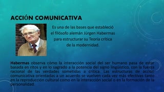 Este documento describe la importancia de la acción comunicativa en el contexto educativo. Explica que la acción comunicativa es fundamental para la interacción social y el aprendizaje, involucrando tanto el trabajo expresivo del profesor al enseñar como el trabajo perceptivo del estudiante al aprender. También describe los roles de los actores comunicativos, los medios pedagógicos, y la importancia del diálogo para lograr acuerdos entre profesor y estudiantes.
