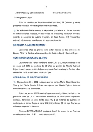 El documento resume las acusaciones de corrupción, crímenes de lesa humanidad y establecimiento de una dictadura durante el gobierno de Alberto Fujimori en Perú entre 1990 y 2000. Se detallan varios casos de asesinatos, esterilizaciones forzadas, robo de fondos públicos, compra de medios de comunicación y congresistas, fraude electoral y colusión con el narcotráfico por parte de Fujimori y su asesor Vladimiro Montesinos. Se mencionan también investigaciones pendientes contra miembros de la fam