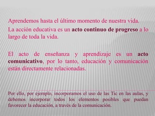 La acción educativa es un proceso continuo a lo largo de la vida que implica la planificación intencional de objetivos educativos. Implica trabajar múltiples inteligencias de los estudiantes para formar ciudadanos con conciencia crítica sobre principios sociales. La educación puede clasificarse en formal, no formal e informal, cada una con un papel complementario en el desarrollo integral del individuo.