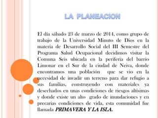 El documento describe una visita a la comunidad Primavera y La Isla en Neiva, Colombia. Los estudiantes observaron las precarias condiciones de vida de la población, incluyendo viviendas construidas con materiales desechados, inundaciones, basura y aguas residuales. La comunidad carece de servicios básicos y se encuentra en un estado de pobreza y abandono. Los niños son especialmente vulnerables debido a su entorno insalubre y falta de oportunidades.