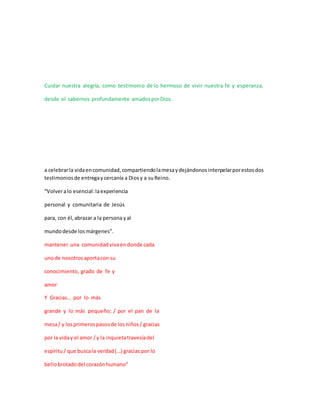El documento da gracias a Dios por los 136 años del Colegio de los Sagrados Corazones, sus fundadores y su espiritualidad inspirada en los corazones de Jesús y María. También agradece por el ejemplo del padre Damián de Molokai y por la vida de las hermanas religiosas y maestros que han formado parte de la comunidad a lo largo de los años.