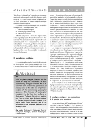 Este documento discute las corrientes pedagógicas contemporáneas y sus implicaciones en las tareas del docente y el desarrollo curricular. Identifica tres corrientes principales: el paradigma ecológico, las pedagogías críticas y el constructivismo. Explica que el paradigma ecológico ve la escuela como un ecosistema social humano y estudia las interacciones entre sus elementos. También analiza algunas tendencias emergentes relacionadas con aspectos curriculares, didácticos y organizativos.