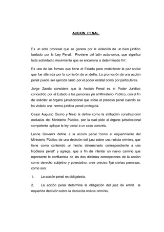 El documento habla sobre la acción penal. Explica que la acción penal pública es ejercida de forma exclusiva por el Ministerio Público para perseguir delitos en contra de la sociedad. También menciona que existen algunos delitos de acción privada que solo pueden ser perseguidos si la víctima presenta una denuncia. Finalmente, destaca que la acción penal tiene como objetivo restablecer el orden social alterado por la comisión de un delito de acuerdo a la ley.
