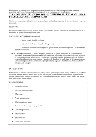 El documento describe varias actividades tutoriales para el desarrollo de la percepción y expresión emocional en estudiantes. Incluye el uso de tarjetas de emociones para que los estudiantes expresen cómo se sienten, ver una película sobre emociones y discutirlas, y ejercicios musicales para identificar emociones. También presenta una técnica llamada "Cariñograma" para fomentar la comunicación positiva a través del agradecimiento, felicitaciones y disculpas.