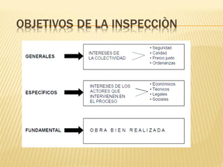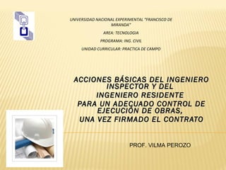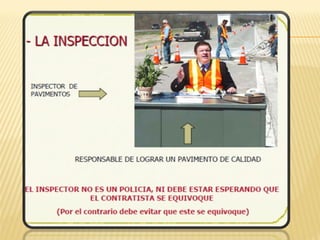 El ingeniero inspector y el ingeniero residente deben revisar el contrato y proyecto, verificar permisos, y ubicar las instalaciones provisionales. Luego deben obtener documentos necesarios, estudiar la documentación, y reconocer la zona de construcción. Durante la ejecución de la obra supervisan el programa de trabajo, realizan mediciones y valuaciones, y mantienen registros. Al finalizar la obra elaboran el acta de terminación, cuadro de cierre de cantidades, y planos de construcción para la recepción provisional y definitiva de la obra