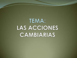 Este documento define la acción cambiaria como el derecho legal a exigir el pago de una letra de cambio u otro título valor. Explica que la acción cambiaria puede ser directa contra el aceptante o de regreso contra los demás firmantes si el aceptante no paga. También establece los requisitos y procedimientos para ejercer la acción cambiaria a través de un juicio ejecutivo mercantil.