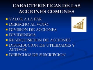 Las acciones comunes representan el derecho de propiedad de un inversionista sobre el capital social de una sociedad anónima. Cada acción común otorga idénticos derechos de voto y a la distribución de dividendos a sus tenedores. Las características clave de las acciones comunes incluyen su valor a la par, el derecho al voto, la división de acciones, los dividendos, la readquisición de acciones y la distribución de utilidades y activos.