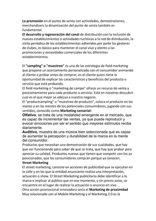 El documento habla sobre estrategias de marketing y acciones promocionales innovadoras como el field marketing, street marketing y marketing de proximidad para mejorar la percepción del cliente sobre el club de productos. Describe técnicas como muestras de producto, eventos y actuaciones en la calle para generar una conexión emocional entre las marcas y los clientes. El objetivo es crear una relación de fidelidad a través de un enfoque personalizado.