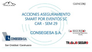Este documento presenta las acciones de aseguramiento de seguridad eléctrica realizadas por Consegesa S.A. en San Cristóbal / Carahuacra durante la semana 29. Incluye capacitaciones al personal sobre IPERC continuo, auditorías de IPERC y limpieza de áreas de trabajo según cronograma. También cubre inspecciones de permisos de aislamiento y bloqueo de energía, uso de equipos de protección personal y barricadas estándar.