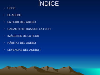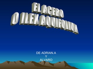 El documento describe los usos y características del acebo. El acebo se usa en ebanistería, marquetería y tornería debido a su madera dura. También se usa su corteza para cazar pájaros y contiene un alcaloide similar a la quinina. Es común como adorno navideño y en jardinería por su belleza y por ser un buen seto. Crece de forma natural en Europa y Asia occidental en bosques de robles y hayas.