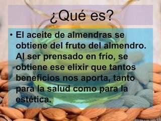 El aceite de almendras se obtiene del fruto del almendro y ofrece beneficios para la salud y la estética, como el fortalecimiento de los huesos y la mejora de la memoria. Es rico en vitaminas y minerales, pero su uso excesivo puede causar irritaciones en la piel. El documento es presentado por un equipo de cinco personas.