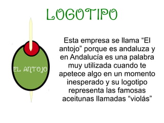La aceitunería "El Antojo" ofrecerá diferentes tipos de aceitunas y bebidas típicas de Huelva a todo tipo de clientes en un establecimiento céntrico y pequeño. El negocio empleará personas con discapacidades móviles para promocionar un servicio rápido de aceitunas a bajo costo que satisfaga antojos repentinos, como su nombre y logotipo de aceitunas violás sugieren.