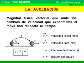 El documento habla sobre la aceleración y el movimiento rectilíneo uniformemente variado (M.R.U.V.). Define la aceleración y explica que mide los cambios en la velocidad de un móvil con respecto al tiempo. Luego presenta ecuaciones para calcular la aceleración, velocidad y distancia en M.R.U.V. y da ejemplos de problemas.